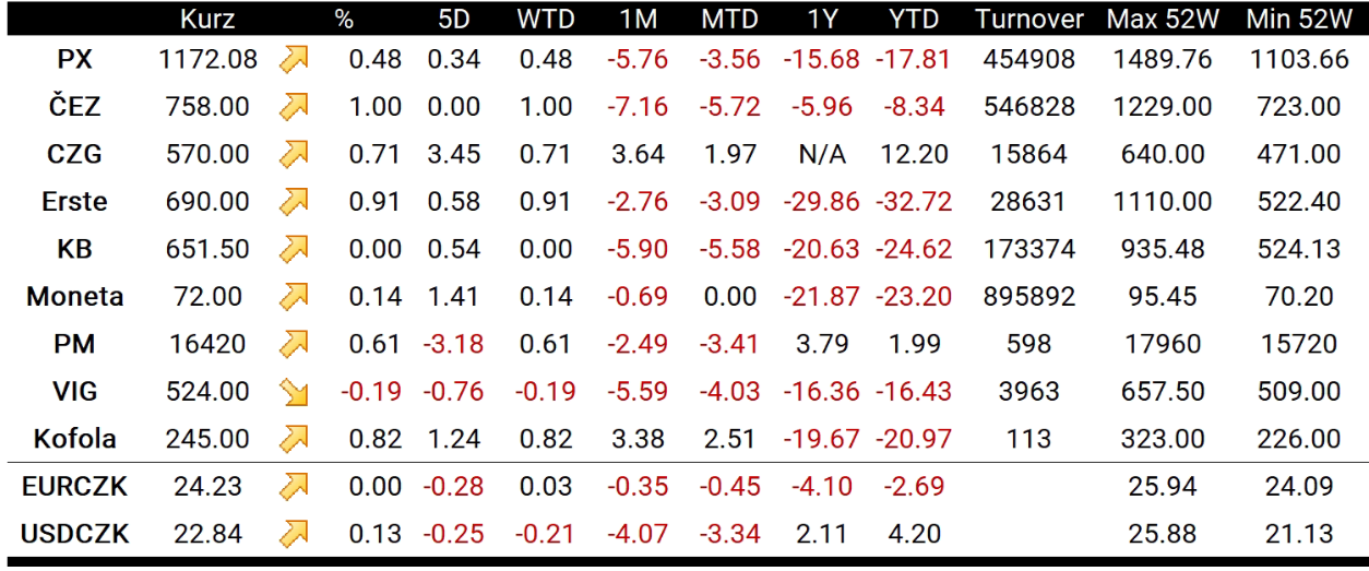 Energetická skupina ČEZ (CEZ1.CZ) si dnes připsala zisk 1 % a seanci uzavřela na 758 korunách za akcii. ČEZ dnes podepsal nezajištěný úvěr umístěný mezi privátní investory ve výši 170 mil. EUR s vypořádáním v lednu 2023. Jedním z aranžérů emise byla i Erste (RBAG.CZ), jejíž akcie si dnes připsaly 0,91% zisk. Komerční banka (KOMB.CZ) se dnes obchodovala do strany.