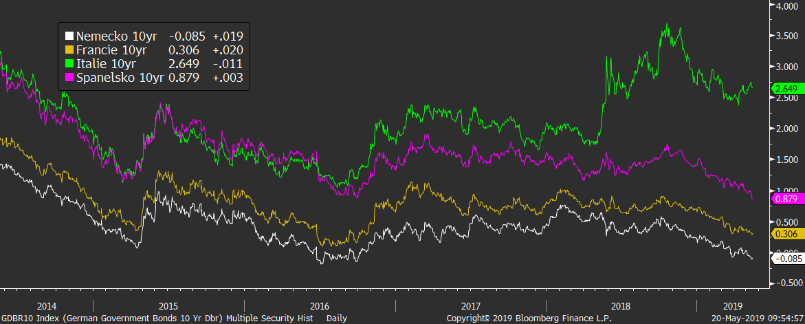 Přestože je nálada na trzích nervózní, na většině trhů s dluhopisy vládne absolutní pohoda. Potvrzuje to i pohled na aktuální výši desetiletých výnosů v Evropě, kde se výnosy z německých a francouzských desetiletých dluhopisů pohybují nejníže od roku 2016, zatímco španělské výnosy klesly rovnou na historické minimum.