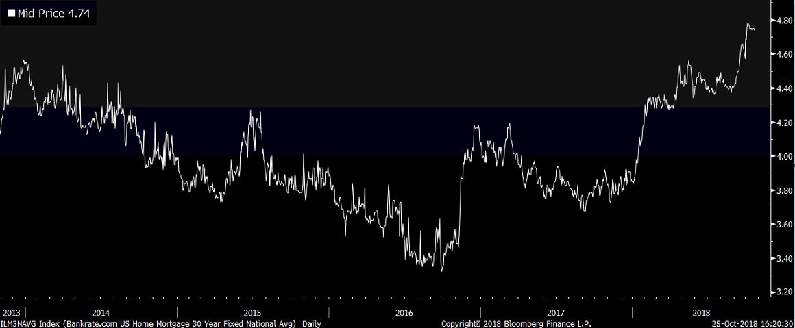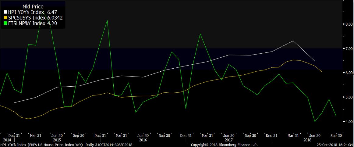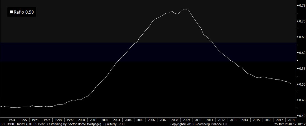 Vývoj dôvery stavebníkov naznačuje, že sa zatiaľ nedeje nič strašné. Vyššie sadzby však zákonite budú znamenať o niečo slabšiu aktivitu na trhu s bývaním, než na akú bola ekonomika zvyknutá medzi 2016 a Q2 2018. Do určitej miery to spomalí rast HDP (primárne skrz nižšie investície do nehnuteľností). Kolaps na trhu s bývaním ako v polovici minulej dekády však rozhodne nehrozí. Podiel hypotekárneho dlhu v americkej ekonomike k HDP klesol v druhom kvartáli na 50%, čo predstavuje najnižšiu úroveň od roku 2001. Pred krízou bol nad 70% a na rozdiel od dneška zaznamenával rastúci trend.