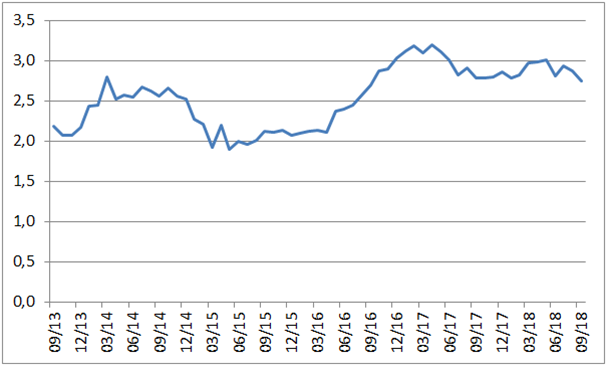 Podstatne väčšie riziko vidíme na strane inflácie. V septembri spomalil medziročný rast cien bývania (vrátane výbavy domácností a ďalších jadrových výdavkov na domácnosť) v rámci indexu spotrebiteľských cien z 2,9% na 2,7%, čo predstavuje najnižšiu úroveň za posledné dva roky. Bývanie má na jadrovej inflácii podiel viac ako 53%, čiže je s odstupom jeho najvýznamnejšou zložkou. Pokiaľ by teda trend pokračoval, čo je reálne, tak by sa inflačné tlaky znížili. A nižšia jadrová inflácia môže spomaliť tempo zvyšovania sadzieb FEDu, čo by malo negatívny dopad na dolár.