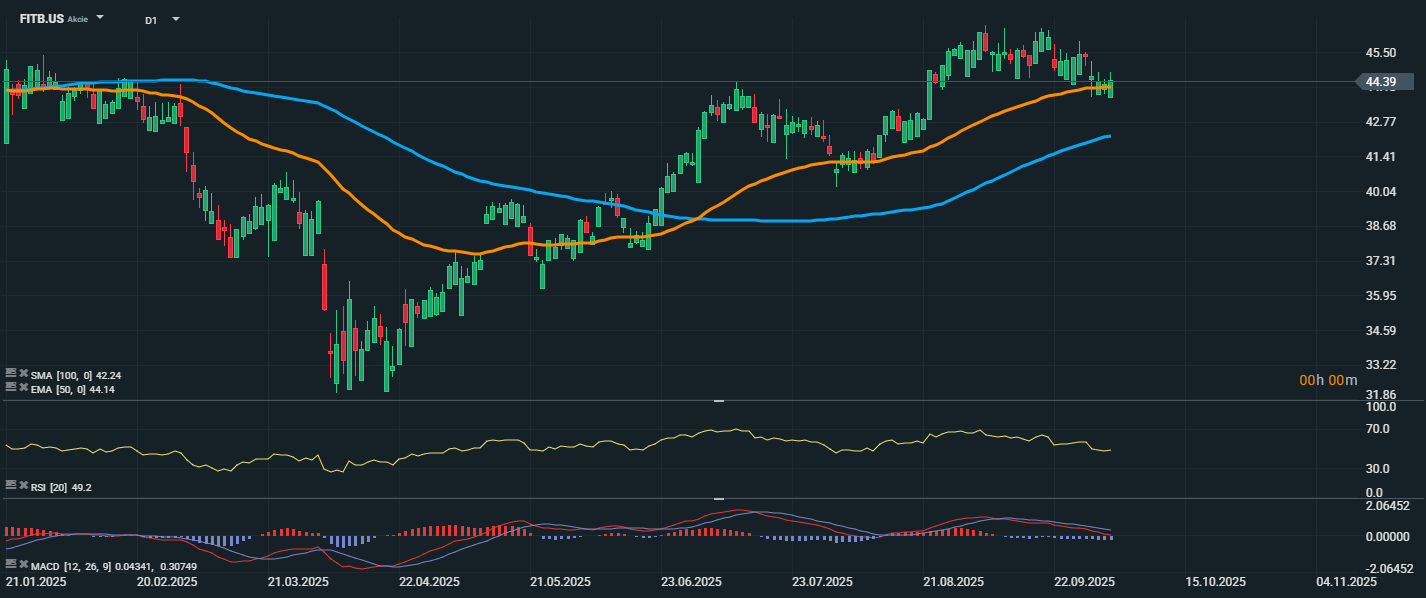 Akcie Fifth Third Bancorp sa aktuálne obchodujú na cene 44,39 USD. Cena sa momentálne pohybuje v blízkosti kĺzavého priemeru EMA 50, a ak dôjde k jeho prerazeniu, môže nasledovať návrat do pásma 42,20–42,50 USD, kde sa nachádza aj 100-dňový kĺzavý priemer. RSI sa pohybuje na úrovni 49,2, teda v neutrálnej zóne, bez náznakov prekúpenosti alebo prepredanosti.