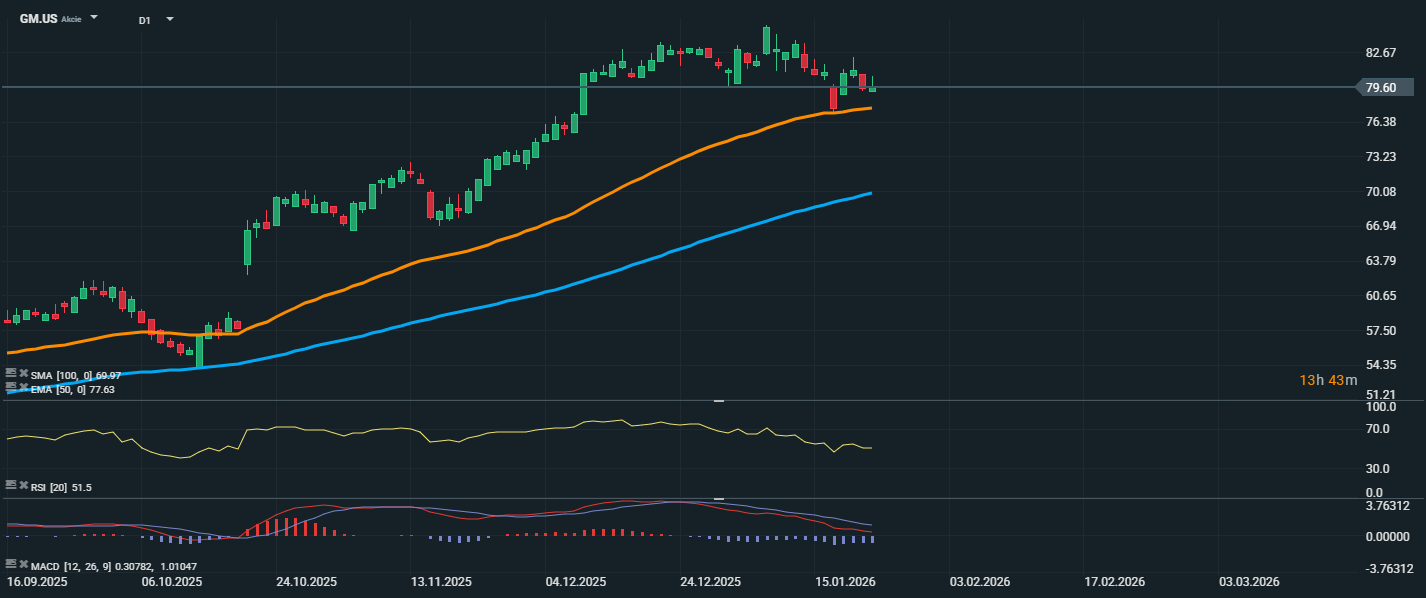 Akcie GM sa obchodujú na úrovni 79,60 USD a podobne ako v prípade Fordu sa nachádzajú v tesnej blízkosti kĺzavého priemeru EMA 50 (77,63 USD). Táto úroveň zatiaľ zafungovala ako podpora a zastavila predchádzajúci mierny pokles. SMA 100 (69,97 USD) zostáva vzdialená, čo naznačuje silný strednodobý rastový trend. RSI sa nachádza na hodnote 51,5, čo poukazuje na neutrálny stav a priestor na ďalší pohyb oboma smermi.