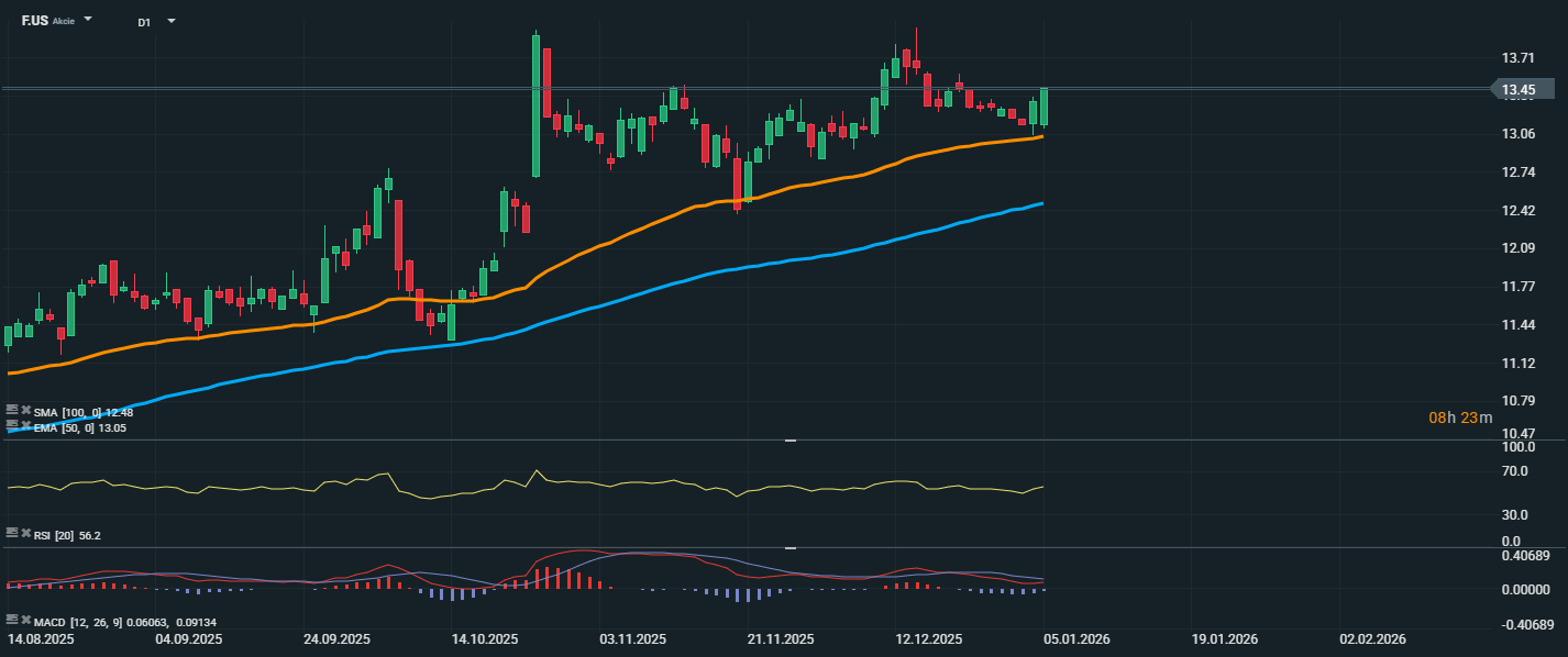 Akcie automobilky Ford sa aktuálne obchodujú na úrovni 13,45 USD, pričom sa odrazili od 50-denného kĺzavého priemeru EMA (13,05 USD) a naďalej sa držia stabilne nad 100-denným SMA (12,48 USD). Technický obraz naznačuje udržanie býčej štruktúry, a to aj napriek volatilnému prostrediu na automobilovom trhu. RSI je na úrovni 56,2 bodu, čo značí neutrálne až mierne pozitívne momentum bez známok prekúpenosti. Cena sa po niekoľkotýždňovej konsolidácii odrazila od priemerov a pokúša sa nadviazať na predchádzajúci rastový trend.