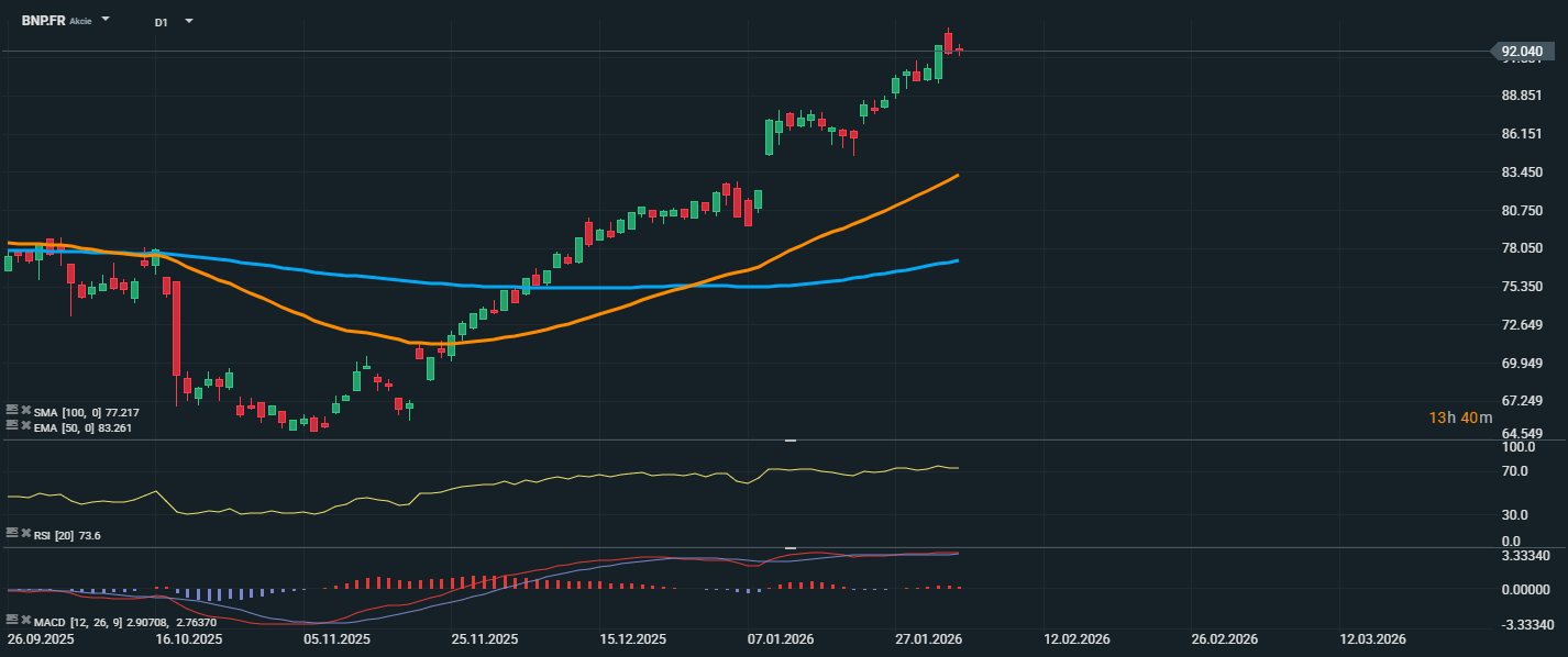 Akcie BNP Paribas sa v súčasnosti obchodujú za 92,04 EUR. Cena je výrazne nad kĺzavými priemerkami – EMA 50 (83,26 EUR) a SMA 100 (77,21 EUR) – čo potvrdzuje silný býčí trend. RSI je na úrovni 73,6, čo presahuje prah prekúpenosti, čo naznačuje zvýšené riziko krátkodobej korekcie. MACD zostáva pozitívny, s rastúcim histogramom a vzdialenosťou od signálnej línie, čo podporuje pokračovanie rastového trendu. Technický výhľad zostáva pozitívny, hoci trh môže čeliť menším výkyvom v dôsledku realizácie ziskov.