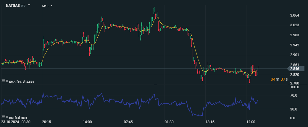 Analýza pohybu cien zemného plynu: Intradenné výkyvy v cenách zemného plynu zobrazené na 15-minútovom grafe, ktoré ukazujú volatilitu okolo EMA (Exponenciálny kĺzavý priemer) na hodnote 2.834 a RSI (Index relatívnej sily) na hodnote 55.5, čo naznačuje mierny býčí trend. Zdroj: xStation5