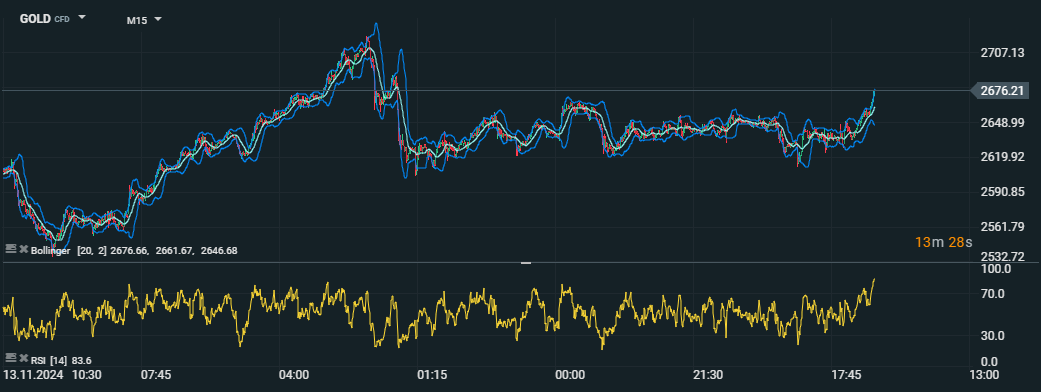 Pohyb ceny zlata za posledných 24 hodín s RSI indikátorom a Bollingerovými pásmami – 13. novembra 2024. Zdroj: xStation5
