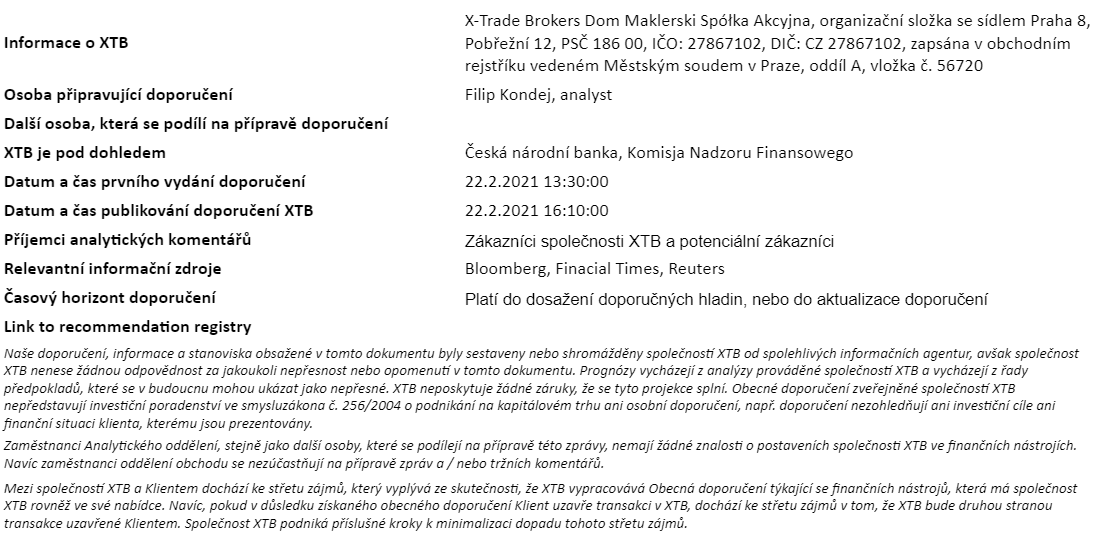 Tento materiál je marketingovou komunikáciou v zmysle čl. 24 ods. 3 smernice Európskeho parlamentu a Rady 2014/65/EÚ z 15. mája 2014 o trhoch s finančnými nástrojmi, ktorou sa mení smernica 2002/92/ES a smernica 2011/61/EÚ (MiFID II). Marketingová komunikácia nie je investičným odporúčaním ani informáciou odporúčajúcou alebo navrhujúcou investičnú stratégiu v zmysle nariadenia Európskeho parlamentu a Rady (EÚ) č. 596/2014 zo 16. apríla 2014 o zneužívaní trhu (nariadenie o zneužívaní trhu) a o zrušení smernice Európskeho parlamentu a Rady 2003/6/ES a smerníc Komisie 2003/124/ES, 2003/125/ES a 2004/72/ES a delegovaného nariadenia Komisie (EÚ) 2016/958 z 9. marca 2016, ktorým sa dopĺňa nariadenie Európskeho parlamentu a Rady (EÚ) č. 596/2014, pokiaľ ide o regulačné technické predpisy upravujúce technické opatrenia na objektívnu prezentáciu investičných odporúčaní alebo iných informácií, ktorými sa odporúča alebo navrhuje investičná stratégia, a na zverejňovanie osobitných záujmov alebo uvádzanie konfliktov záujmov v zmysle zákona č. 566/2001 Z. z. o cenných papieroch a investičných službách. Marketingová komunikácia je pripravená s najvyššou starostlivosťou, objektivitou, prezentuje fakty známe autorovi k dátumu prípravy a neobsahuje žiadne hodnotiace prvky. Marketingová komunikácia je pripravená bez zohľadnenia potrieb klienta, jeho individuálnej finančnej situácie a nijakým spôsobom nepredstavuje investičnú stratégiu. Marketingová komunikácia nepredstavuje ponuku na predaj, ponuku, predplatné, výzvu na nákup, reklamu alebo propagáciu akýchkoľvek finančných nástrojov. XTB S.A. organizačná zložka nezodpovedá za žiadne kroky alebo opomenutia klienta, najmä za nadobudnutie alebo predaj finančných nástrojov. XTB nezodpovedá za žiadnu stratu alebo škodu, vrátane, bez obmedzenia, akejkoľvek straty, ktorá môže vzniknúť priamo alebo nepriamo, spôsobená na základe informácií obsiahnutých v tejto marketingovej komunikácii. V prípade, že marketingová komunikácia obsahuje akékoľvek informácie o akýchkoľvek výsledkoch týkajúcich sa finančných nástrojov v nej uvedených, nepredstavujú žiadnu záruku ani prognózu budúcich výsledkov. Minulá výkonnosť nemusí nevyhnutne naznačovať budúce výsledky a každá osoba konajúca na základe týchto informácií tak robí výlučne na vlastné riziko.