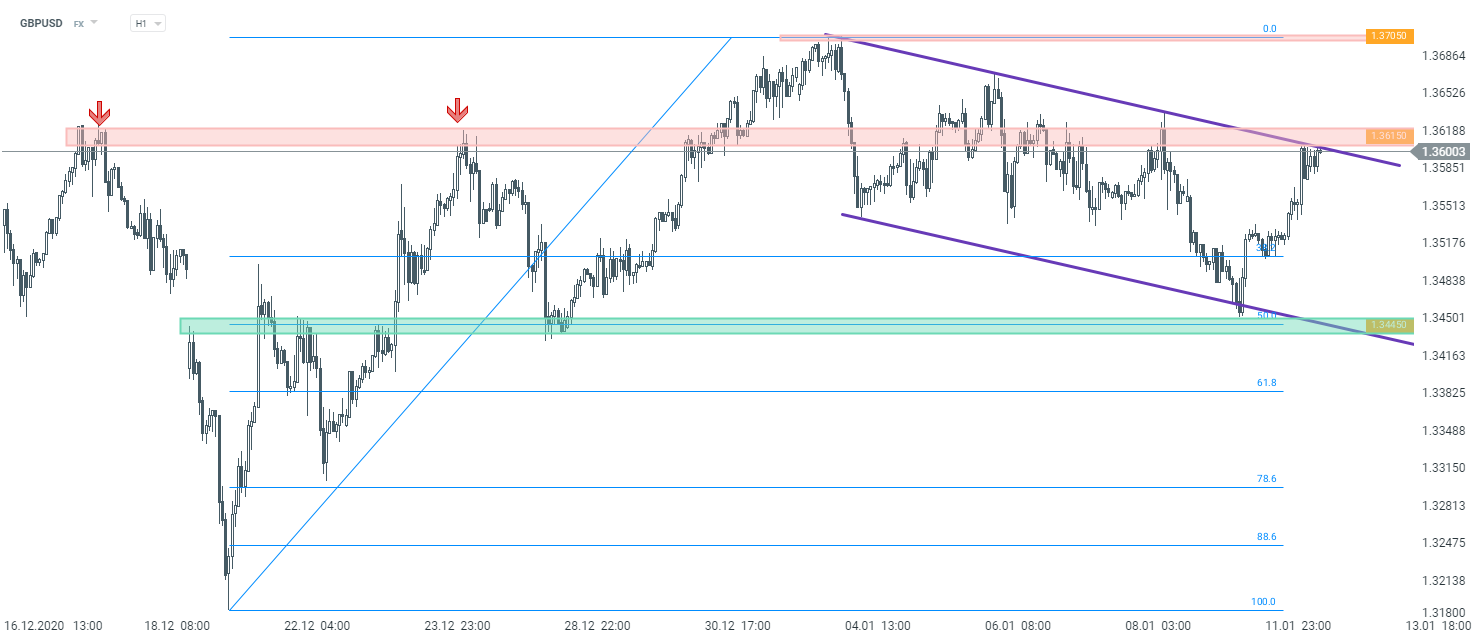 Ak sa pozrieme na pár GBPUSD z technického hľadiska, je možné vidieť, že včera sa cena odrazila od zóny podpory, ktorá sa nachádza na hladine 1,3445 a dnes sa pokračuje v pohybe nahor. Avšak vzostupná hybnosť sa vytratila tesne pod kľúčovou rezistenciou na hodnote 1,3615, ktorá je označená predchádzajúcimi cenovými reakciami a hornou hranicou miestneho zostupného kanálu. Ak by sa cena dostala nad túto úroveň, zostane otvorená cesta k nedávnym maximám na hodnote 1,3705. Na druhej strane, ak sa tu predajcom podarí zastaviť nárast, mohol by sa spustiť ďalší impulz smerom nadol k podpore na hodnote 1,3445.