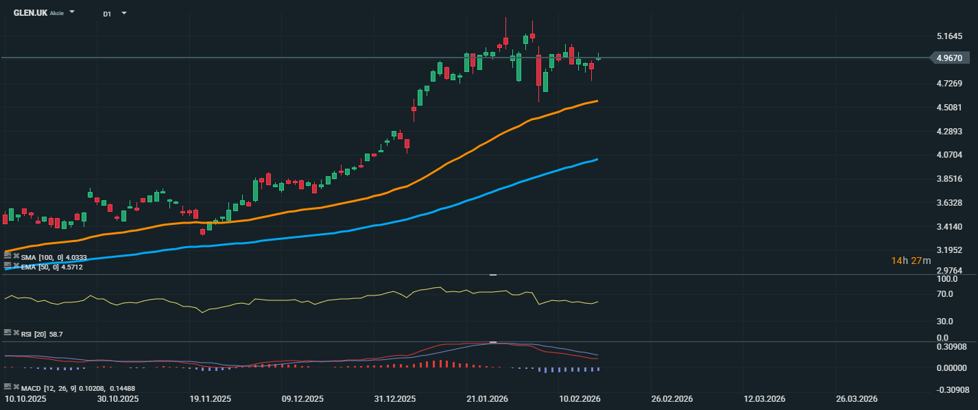 Akcie spoločnosti Glencore Plc sa obchodujú v blízkosti úrovne 4,97 GBP a pohybujú sa tesne pod lokálnou rezistenciou okolo 5,16 GBP. Cena sa drží nad EMA 50 (4,57 GBP) aj nad SMA 100 (4,03 GBP), pričom oba priemery majú rastúci sklon. To potvrdzuje strednodobé býčie nastavenie trhu. EMA 50 aktuálne funguje ako dynamická podpora, zatiaľ čo SMA 100 predstavuje silnejší technický základ v prípade hlbšej korekcie. Z technického pohľadu je kľúčové sledovať oblasť 5,16 GBP, kde sa nachádza aktuálna rezistencia. Jej prerazenie by mohlo otvoriť priestor na ďalší posun smerom k 5,40–5,60 GBP. Naopak, pri neúspešnom pokuse o prerazenie možno očakávať návrat k podpore okolo 4,57 GBP (EMA 50), prípadne hlbšie k 4,30 GBP, kde sa nachádza predchádzajúce konsolidačné pásmo.