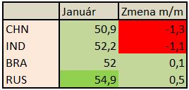 Podobne je tomu aj pri rozvíjajúcich sa ekonomikách. Vo všetkých štyroch najväčších je nevýrobná dôvera nad 50b., teda vo fáze expanzie. V Rusku je dokonca expanzia veľmi solídna. V dvoch najväčších ekonomikách však rast relatívne prudko spomaľuje, najpomalší je v Číne, ktorú ťahá nadol obchodný spor s USA.