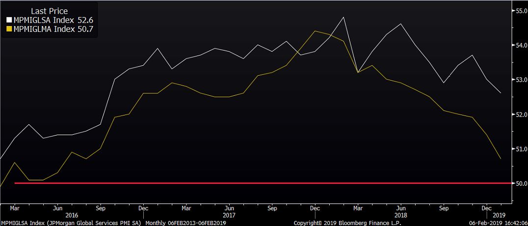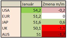 Celkovo je vývoj lepší ako pri výrobnej dôvere, kde sa to v tabuľkách červenalo ďaleko viac. A to najmä v krajinách so silnejšími ekonomickými väzbami na Čínu. Aj dôvera v službách však v globálnom porovnaní klesá, aktuálne je globálny index dôvery v službách z dielne JP Morgan najnižšie od jesene 2016, je však podstatne vyššie ako výrobná dôvera a naďalej je vo fáze relatívne solídneho rastu. A to predovšetkým vďaka USA. A keďže v službách pracuje ďaleko viac ľudí ako vo výrobe, tak je to dobrá správa aj pre globálny trh práce.