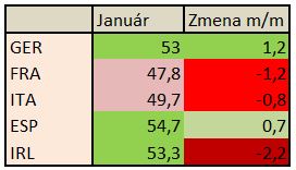 Pozrime sa ešte do eurozóny, kde je vývoj zmiešaný – solídny rast vykazuje Nemecko, Španielska a Írsko, naopak vo Francúzsku a Taliansku je sektor služieb v kontrakcii. Rôzne sa vyvíja aj momentum – v Nemecku sa rast solídne zrýchlil, v Španielsku mierne, Francúzsku a Taliansku klesol index pomerne výrazne a v Írsku dokonca prudko. Čiže v eurozóne je to nerovnomerné.