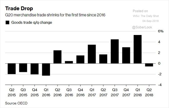 Svetový obchod začína pociťovať obchodné vojny. V druhom kvartáli klesol objem svetového obchodu prvý krát od roku 2016. V tom čase však bol primárnym dôvodom prepad cien ropy, ktorá tvorí nemalú časť globálneho obchodu.