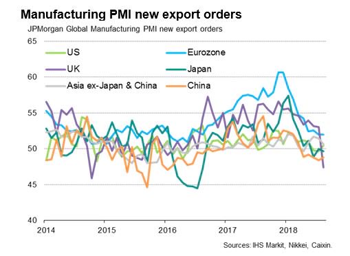 Spomalenie predznačujú aj ďalšie indikátory. Subindex nových exportných objednávok v rámci indexov výrobnej dôvery klesá po celom svete. Obchodné vojny, prípadne obavy o ich vyhrotenie, teda už majú dopad na ekonomiku.