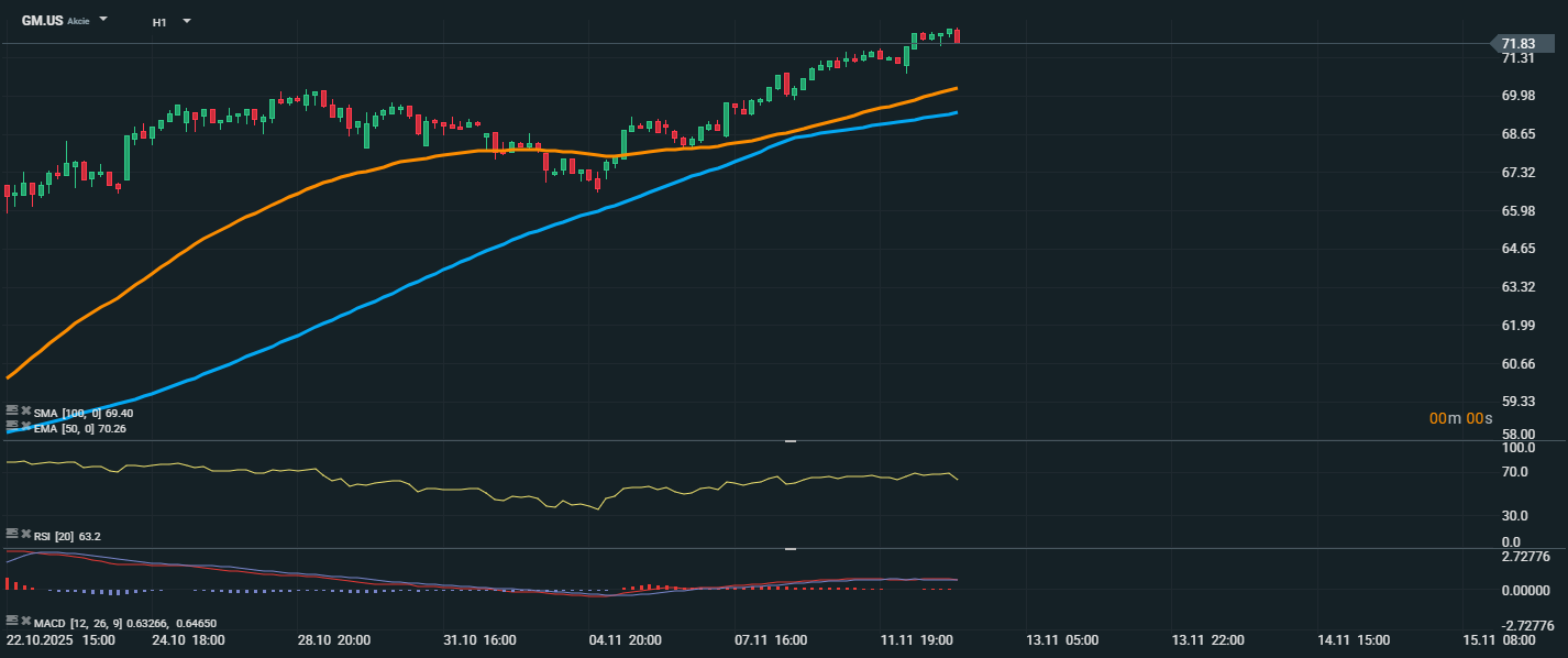 Akcie General Motors sa obchodujú na úrovni 71,31 USD a pokračujú v rastovom trende. Cena sa stabilne drží nad kĺzavými priemermi – konkrétne nad EMA 50 (70,26 USD) aj nad SMA 100 (69,40 USD), čo potvrdzuje silné býčie momentum. RSI (63,2) naznačuje zvýšený nákupný záujem, no zatiaľ sa nenachádza v prekúpenom pásme, čo ponecháva priestor na pokračovanie rastu.