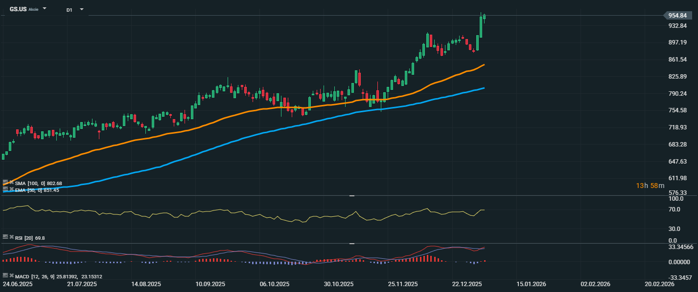 Akcie spoločnosti Goldman Sachs pokračujú v silnom rastovom trende a aktuálne sa obchodujú na historickom maxime 954,84 USD. Po konsolidácii ku koncu roka 2025 došlo k obnoveniu rastového momenta, ktoré viedlo k prudkému cenovému prielomu smerom nahor. Cena sa naďalej drží výrazne nad kĺzavými priemermi EMA 50 (831,45 USD) a SMA 100 (802,68 USD), čo potvrdzuje dlhodobo býčie technické nastavenie. Všetky korekcie z posledných mesiacov boli rýchlo vykúpené a trend zostáva stabilný. RSI sa aktuálne nachádza na hodnote 69,8, teda tesne pod úrovňou prekúpenosti (70). To značí silný nákupný záujem, ale zároveň upozorňuje na možnosť krátkodobého spomalenia alebo miernej korekcie.