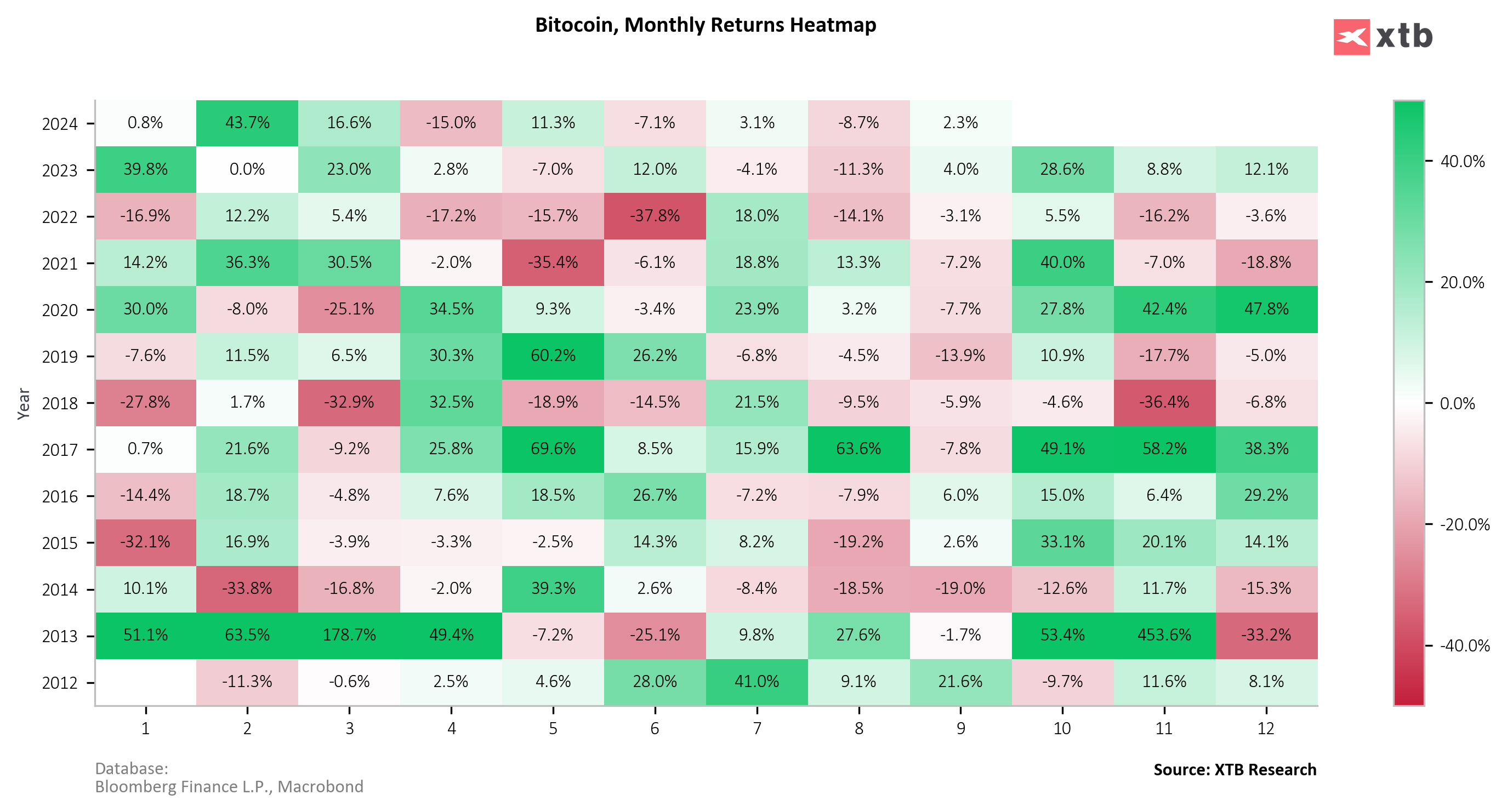 September je pre Bitcoin historicky sezónne slabým mesiacom s priemerným mesačným výnosom -2 %. Október však bol historicky jedným z najlepších mesiacov, čo by sa mohlo dobre spájať s potenciálnym zmiernením menovej politiky.