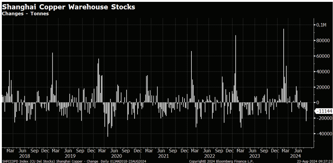 - V júli však vývoz medi z Číny nečakane klesol o 70 tis. ton, keďže zásoby na šanghajskej burze sa neustále znižovali. Posledné dva týždne podľa správy Hightower zaznamenali najväčší pokles domácich zásob medi, a to za celý rok 2024 (24, resp. 11,1 tis. ton). V dôsledku toho investori začínajú prehodnocovať, či ide o sezónny efekt a anomáliu, alebo či sa dopyt po medi v čínskej ekonomike skutočne začal pomaly zotavovať.