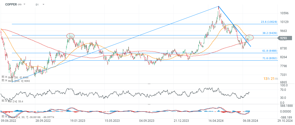 - Od začiatku augusta kontrakty na meď vzrástli o takmer 8 % na vlne klesajúcich čínskych zásob, oslabujúceho dolára a zvyšujúcich sa šancí na zníženie sadzieb Federálneho rezervného systému. Teraz, keď kontrakty dosiahli zónu odporu, investori možno opäť "zvažujú" fundamentálne faktory stojace za udržaním odrazu v čase, keď výhľad svetového hospodárstva vrátane čínskeho zostáva neistý.