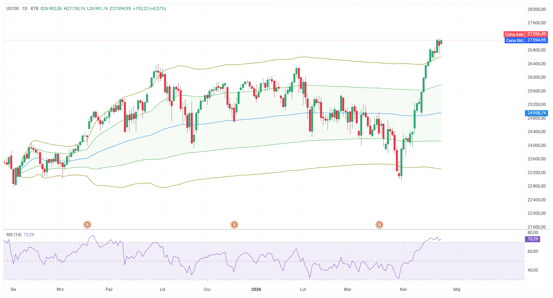 Na dennom grafe US100 vidíme jasný uptrend, ktorý trvá od minima okolo 24 959 bodov na prelome roka a dostal index na súčasné úrovne okolo 27 095 bodov. Cena sa pohybuje v rámci dobre štruktúrovaného rastového kanála a systematicky vytvára vyššie maximá aj vyššie minimá, čo potvrdzuje silu býkov. Za pozornosť však stojí indikátor RSI(14), ktorý dosiahol hodnotu 73,29, a prekonal tak hranicu 70, teda pásmo prekúpenosti. Historicky to signalizuje zvýšené riziko korekcie alebo aspoň konsolidácie. Posledné sviečky navyše naznačujú určité váhanie v blízkosti súčasných maxím a štvrtková seansa, počas ktorej index vytvoril nové intradenné maximum, no napokon uzavrel v červených číslach, môže byť prvým signálom, že rastové momentum slabne.