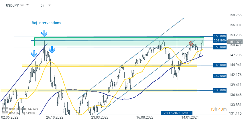 Ako vidíme, USDJPY sa v súčasnosti nachádza nad úrovňou 151, ktorá je v historickej intervenčnej zóne BoJ (na grafe vyznačená zelenou farbou). Pozorujeme tiež prvé pokusy o posilnenie JPY prostredníctvom verbálnych intervencií. Ďalšie oslabovanie JPY, a teda zvýšenie kurzu USDJPY na úroveň 153,000 alebo dokonca 155,000, môže viesť k zintenzívneniu verbálnych intervencií zo strany hlavných tvorcov japonskej menovej politiky a dokonca k vyššej pravdepodobnosti intervencie BoJ na devízovom trhu.