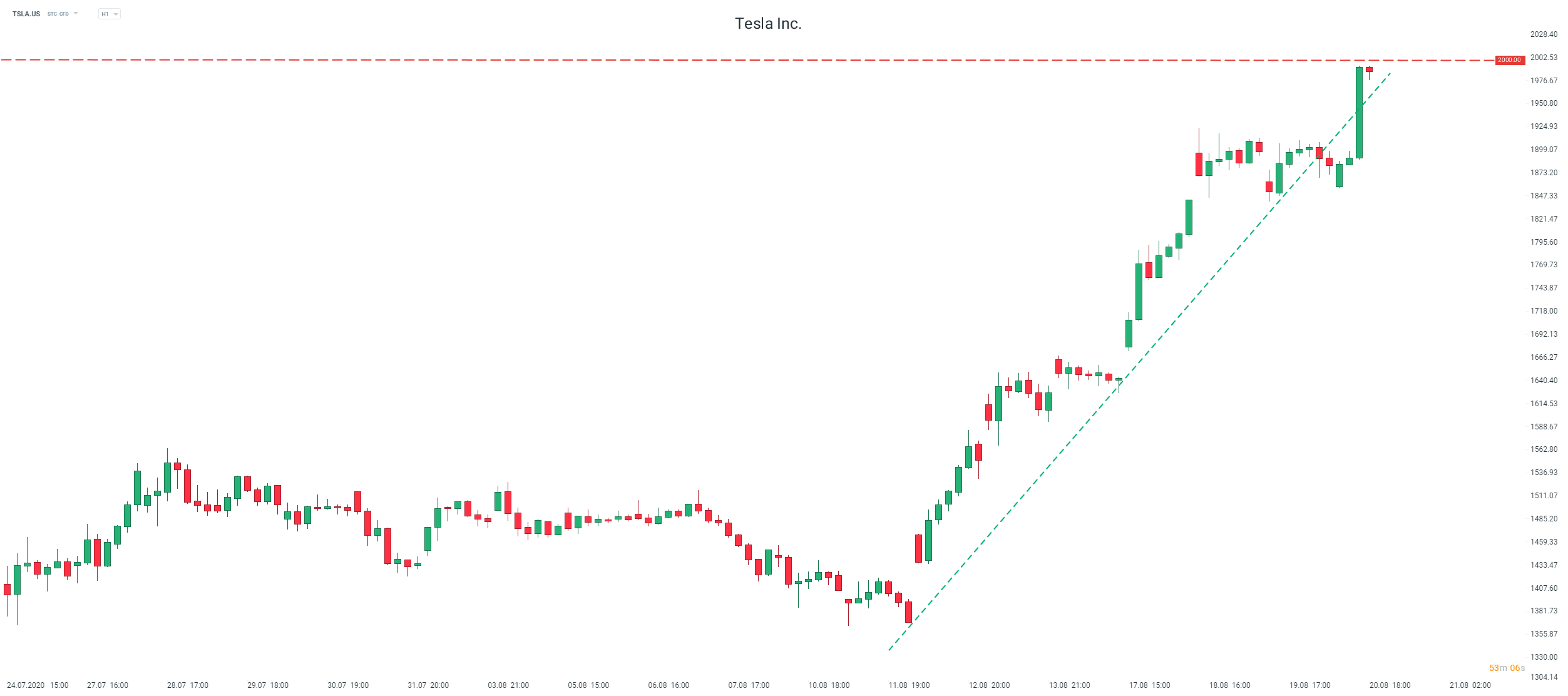 Akcie společnosti Tesla Inc. (TSLA.US) vzrostly nad úroveň 1900 dolarů v úterý v reakci na optimistické zvýšení cílové ceny společnosti Wedbush Securities, a to právě na 1900 dolarů. Ke zvýšení došlo díky akceleraci poptávky v Číně. Dnes po otevření trhů se na akciích projevilo další výrazné pozitivní momentum. Aktivitu přebrali býci a aktuálním růstem o 5,7 % ženou cenu k úrovni 2000 dolarů. Pokud by však rychlý růst nakonec vyprovokoval zájem medvědů, tak důležitá by v tomto případě byla úroveň supportu na 1 841,70 dolarech. Není bez zajímavosti, že tržní kapitalizace společnosti Tesla je aktuálně více než pětinásobkem tržní kapitalizací automobilek Ford a GM. Jen za poslední týden vzrostly akcie Tesly o 45 % a od začátku roku už o 376 %!