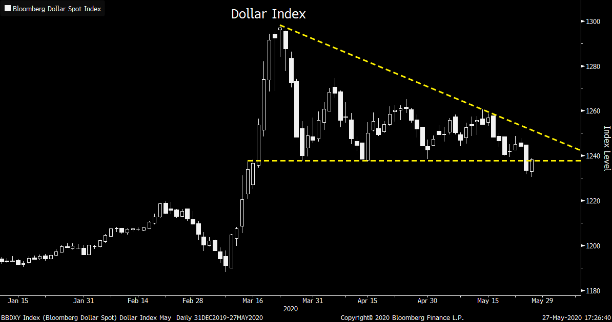 Americký dolar v posledních seancích výrazně oslaboval, což je dobře vidět na posledním vývoji dolarového indexu společnosti Bloomberg, který monitoruje vývoj USD k deseti hlavním světovým měnám. Index prorazil klíčový support, od kterého se v posledních týdnech několikrát odrazil. Včera klesl o 1 % a dostal se na nejnižší úroveň od poloviny března. Hlavním důvodem byl pokles rizikové averze a návrat obchodníků k rizikovým aktivům. Dnes se však situace postupně obrací. Americkému dolaru se daří hlavně na páru s GBP, který má v tomto indexu nejvyšší váhu. USD výrazně roste také na páru s AUD. Hlavním důvodem síly USD je návrat rizikové averze na finanční trhy. Dolar se snaží korigovat část předchozích ztrát. Australská měna naopak výrazně oslabuje kvůli plánům Číny uvalit cla na dovoz uhlí.