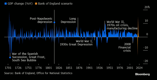 Bank of England očekává propad ekonomiky v letošním roce až o 14 %. Pokud se předpověď potvrdí, bude se jednat o nejhlubší propad ostrovní ekonomiky za poslední více než 3 století. Zdroj: Bloomberg