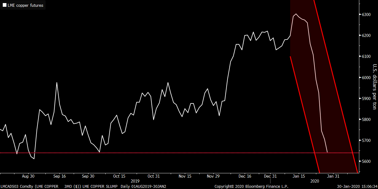 Cena mědi dnes klesá už dvanáctou seanci v řadě. Hlavním důvodem je strach ze situace okolo koronaviru v Číně, která stojí za více než polovinou globální poptávky po tomto kovu. Zdroj: Bloomberg