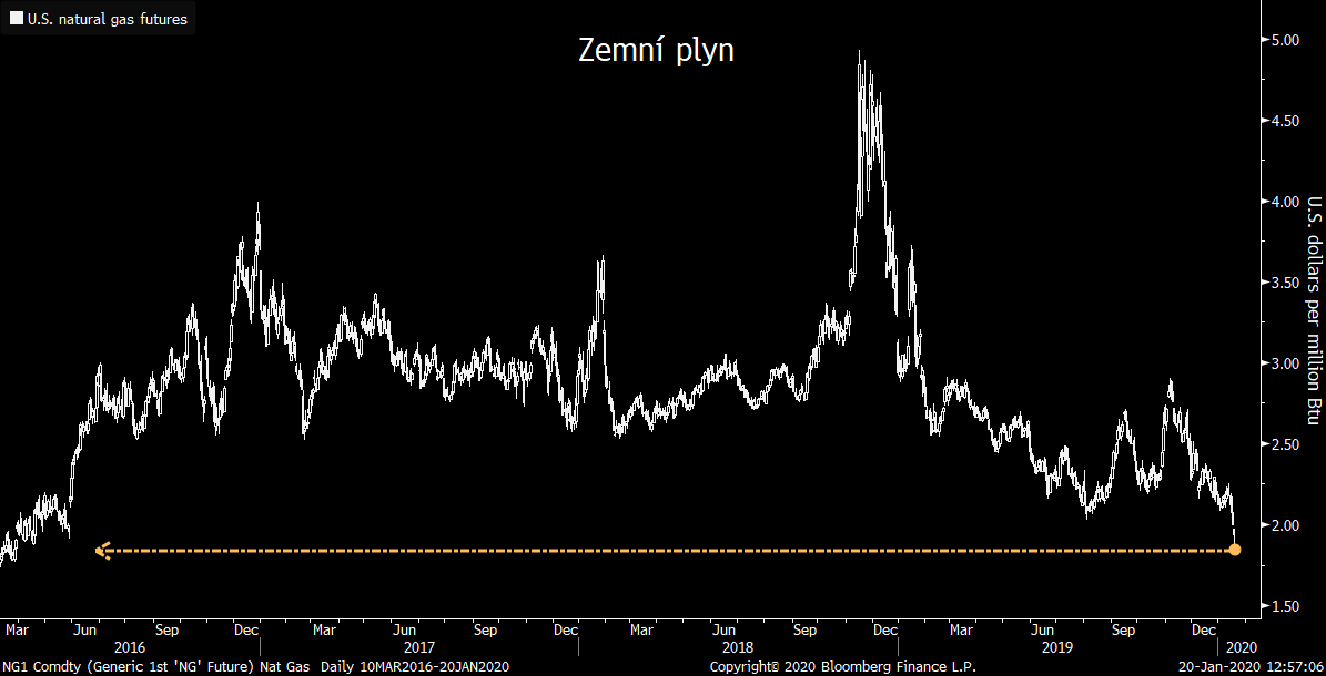 Zemní plyn dnes klesl na nejnižší úrovně od března 2016. Hlavním viníkem je rekordní těžba v USA a relativně mírný průběh zimy v Severní Americe. Zdroj: Bloomberg