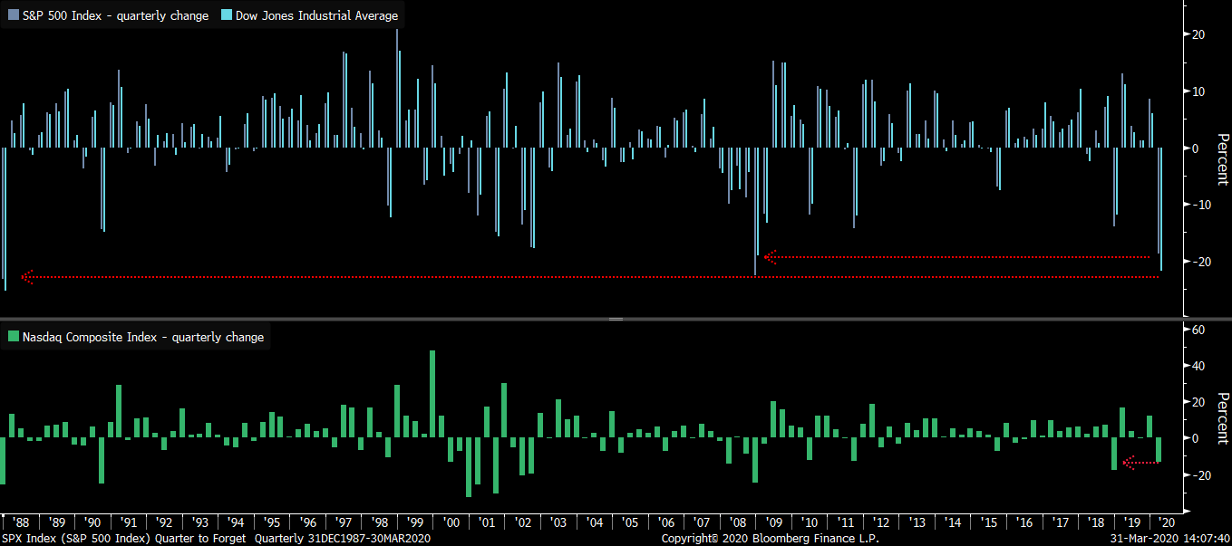 Wall Street má za sebou nejhorší čtvrtletí za poslední roky. Index Dow Jones by dokonce mohl tento kvartál zakončit s nejvyšší ztrátou od Q4/1987. Zdroj: Bloomberg