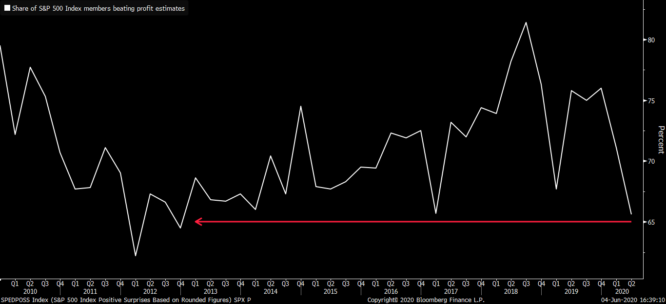 Překonat očekávání ziskovosti se v prvním kvartálu podařilo pouze 65 % společnostem. Jedná se o nejnižší hodnotu od roku 2012. Zdroj: Bloomberg