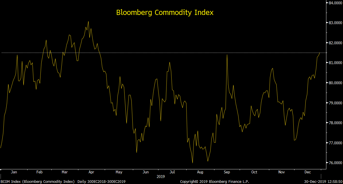 Komoditní trhy neměly v posledních letech na růžích ustláno. Od roku 2011 jejich ceny klesly o více než polovinu. Jedinou výjimkou byl snad jen rok 2016, kdy si vzaly zpět desetinu předchozího poklesu. A špatně by na tom nemusely být komodity ani letos, a to hlavně díky silnému závěru roku. Bloomberg komoditní index vzrostl od začátku roku 2019 do dnešního dne o 6,2 % a aktuálně se obchoduje na nejvyšších úrovních od dubna. Ještě na počátku prosince však přidával pouze půl procenta a reálné hrozilo, že letošní rok bude na komoditních trzích už sedmým ztrátovým z posledních devíti let. Finanční trhy povzbudily v závěru roku centrální banky svoji uvolněnou měnovou politikou a také se investoři konečně dočkali dohody na nové obchodní smlouvě mezi USA a Čínou. Právě Čína je největším spotřebitelem komodit na světě.
