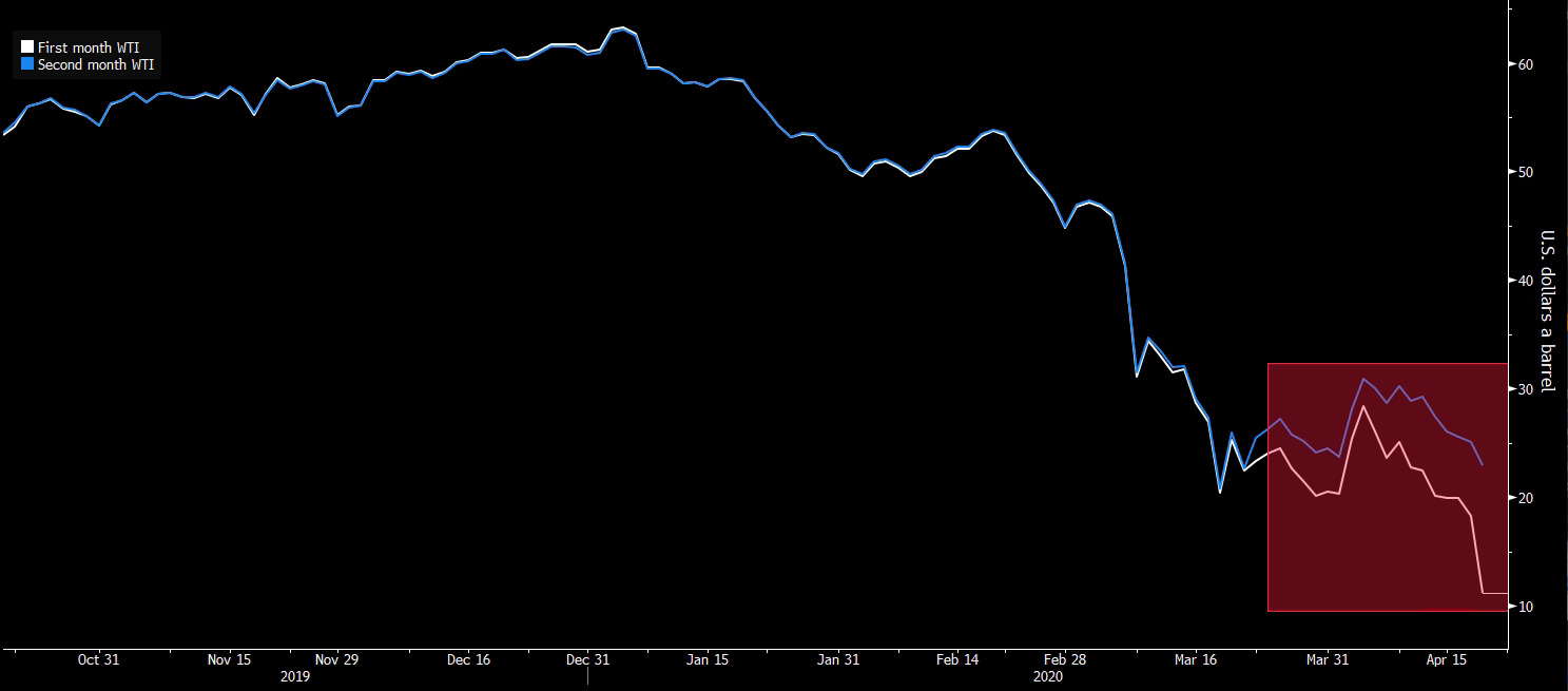 Cenový rozdíl dvou nejbližších ropných futures, obvykle minimální, dosáhl dvanácti dolarů. Cenový rozdíl motivuje obchodníky k nákupu aktuálního kontraktu a prodeji futures kontraktů s delší expirací. Limitním faktorem jsou však rychle se plnící skladovací kapacity. Zdroj: Bloomberg