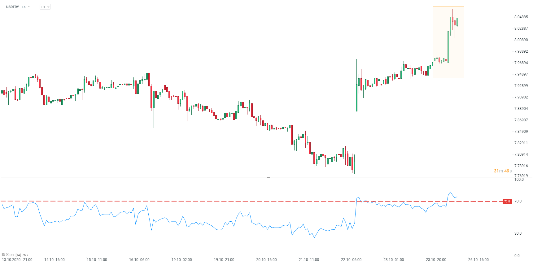 Trh se stále vzpamatovává z šoku z minulého týdne, kdy turecká centrální banka oproti očekávání nezvýšila úrokové sazby. Pár USDTRY se dnes dostal nad 8 lir za dolar poprvé v historii. Oscilátor RSI ukazuje na možnou korekci výrazného vzestupu. Zdroj: xStation5
