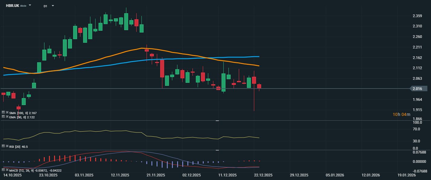Akcie spoločnosti Harbour Energy sa po oznámení akvizície LLOG Exploration za 3,2 miliardy USD dostali pod výrazný tlak. Na grafe vidíme, že cena prudko klesla a prepadla sa pod úroveň 2,00 GBP, kde uzavrela na hodnote 2,016 GBP. Kĺzavé priemery SMA 100 (2,167 GBP) a EMA 50 (2,122 GBP) sú aktuálne nad cenou akcie, čo potvrdzuje zostupný trend. EMA 50 navyše smeruje nadol, čo naznačuje pokračujúcu slabosť. Prerazenie pod obe tieto úrovne koncom novembra znamenalo zmenu sentimentu z býčieho na medvedí. RSI klesol na hodnotu 40,5, čo síce ešte nie je v prepredanom pásme (pod 30), ale signalizuje rastúci predajný tlak a absenciu nákupného záujmu.