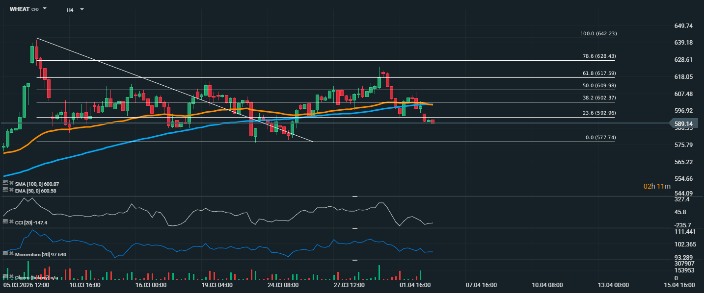 Z technického pohľadu bude teraz kľúčové sledovať, či si pšenica udrží oblasť okolo 577,74. Ak by táto podpora nevydržala, pokles by sa mohol ešte prehĺbiť. Naopak, na zlepšenie sentimentu by bolo potrebné vrátiť cenu späť aspoň nad pásmo 592,96 až 602,37, kde sa nachádzajú nielen Fibonacciho úrovne, ale aj oba dôležité kĺzavé priemery.