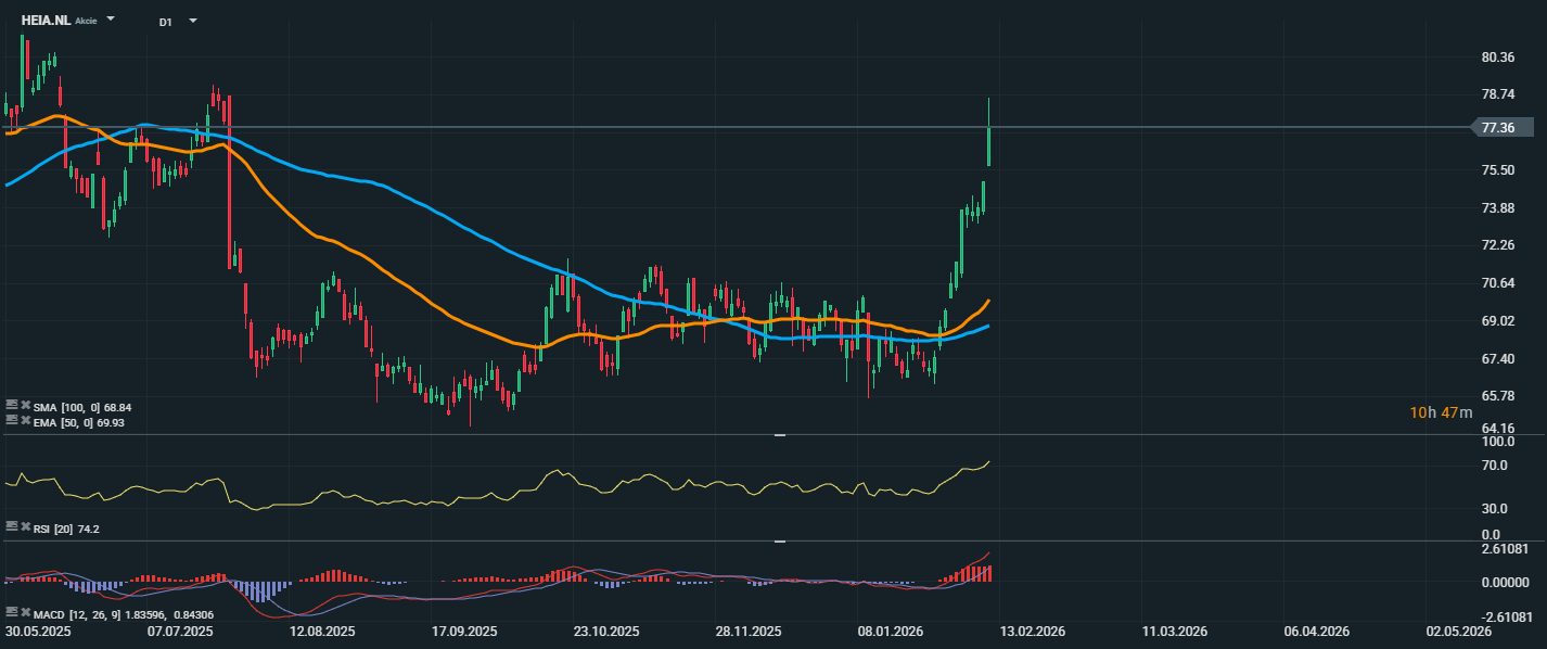 Akcie sa v súčasnosti obchodujú za približne 77,36 EUR, čo je najvyššia úroveň za posledné mesiace. Cena prudko prekonala oba kĺzavé priemery – EMA 50 (69,91 EUR) a SMA 100 (68,84 EUR) – čo potvrdzuje zmenu strednodobého trendu na býčí. Rast sprevádzajú silné býčie sviečky a zvýšená dynamika. Trh sa v súčasnosti blíži k oblasti odporu okolo 77,50 – 78,00 EUR, kde sa nachádzajú predchádzajúce maximá z jesene. Prekonanie tejto úrovne by otvorilo priestor pre ďalší rast smerom k 80 EUR. RSI dosahuje 74,2, čo znamená, že vstupuje do prekúpenej zóny. To potvrdzuje silný nákupný tlak, ale zároveň zvyšuje pravdepodobnosť krátkodobej korekcie alebo konsolidácie. Z technického hľadiska je teraz kľúčové, či sa cena podarí udržať nad úrovňou 75 EUR. Ak áno, býčí scenár zostane dominantný. Návrat pod úroveň 72–73 EUR by naopak znamenal oslabenie súčasnej dynamiky.