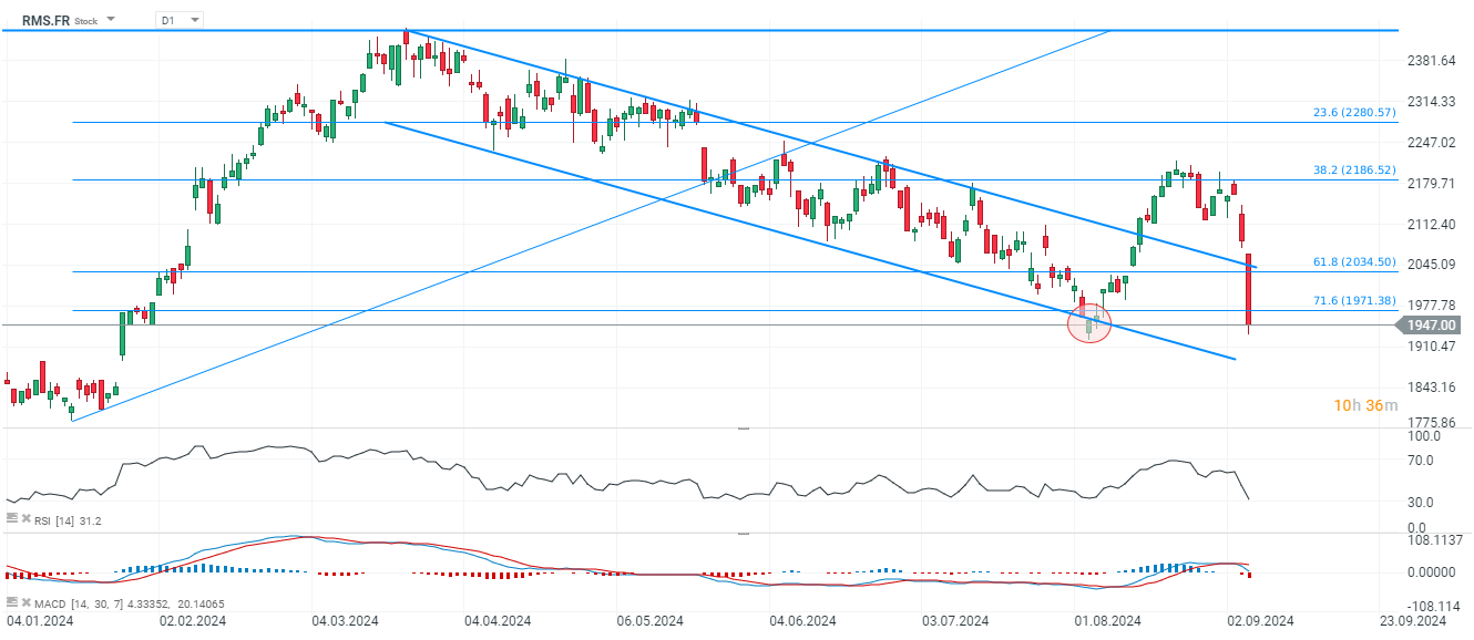 Cena akcií Hermes vymazala takmer všetky ročné zisky a klesla pod Fibonacciho zónu podpory 71,6 na úrovni 1971 EUR za akciu. V najbližšom období nemožno vylúčiť ani test úrovne 1840 EUR.