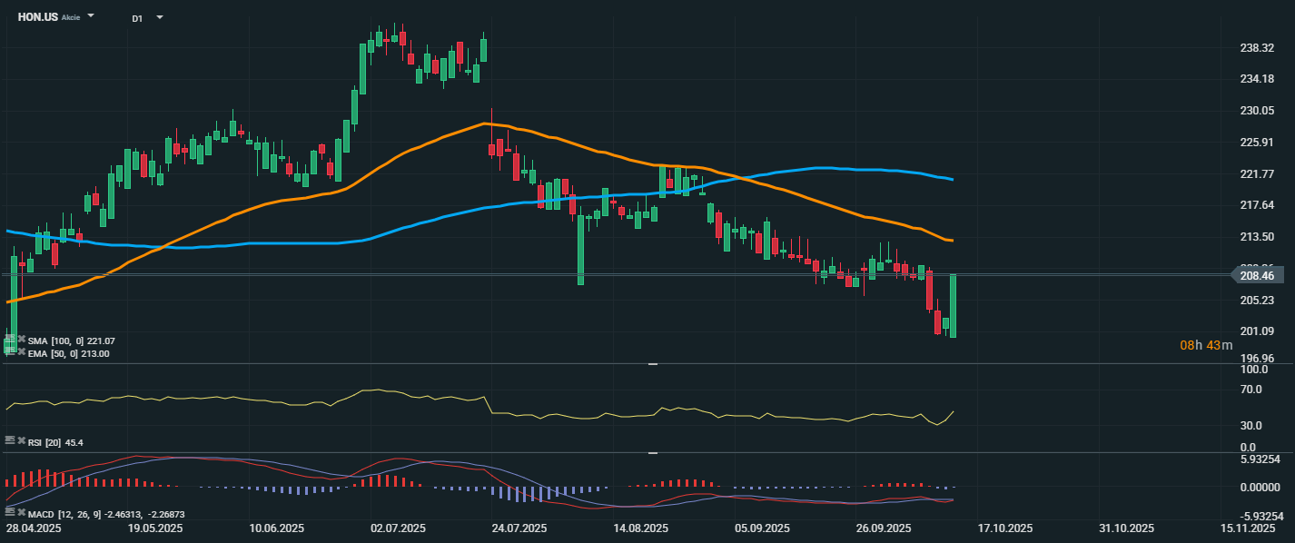 Akcie spoločnosti Honeywell sa aktuálne obchodujú na úrovni 208,46 USD a po krátkodobom poklese vykazujú známky obratu. Posledná sviečka naznačuje silnejší nákupný záujem, ktorý prišiel po prepade k úrovni okolo 201 USD. Napriek tomu však akcie zostávajú pod oboma kĺzavými priemermi – EMA 50 (213,00 USD) a SMA 100 (221,07 USD), čo indikuje stále pretrvávajúci zostupný trend. RSI sa nachádza na úrovni 45,4, teda v neutrálnej zóne, bez známok prepredanosti, ale s priestorom pre ďalší rast.