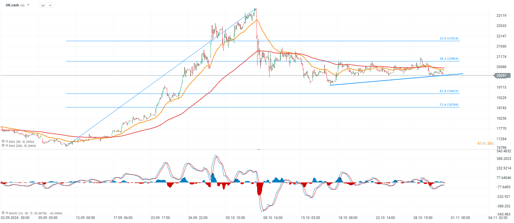 Výdavky na súkromnú spotrebu sa medziročne znížili o 1,4 % a medzištvrťročne o 1,6 %. Dovoz sa za prvých 9 mesiacov roka 2024 znížil o 7,1 %, zatiaľ čo vývoz medziročne vzrástol o 10,7 %. Hongkong za prvých 9 mesiacov roku 2024 navštívilo 32 mil. návštevníkov (medziročne o takmer 40 % viac), ale Čína odhaduje, že tento rok ich bude 46 miliónov, takže stále nie je jasné, či konečné údaje budú v súlade s týmito očakávaniami. HK.cash dnes stráca takmer 0,5 %.
