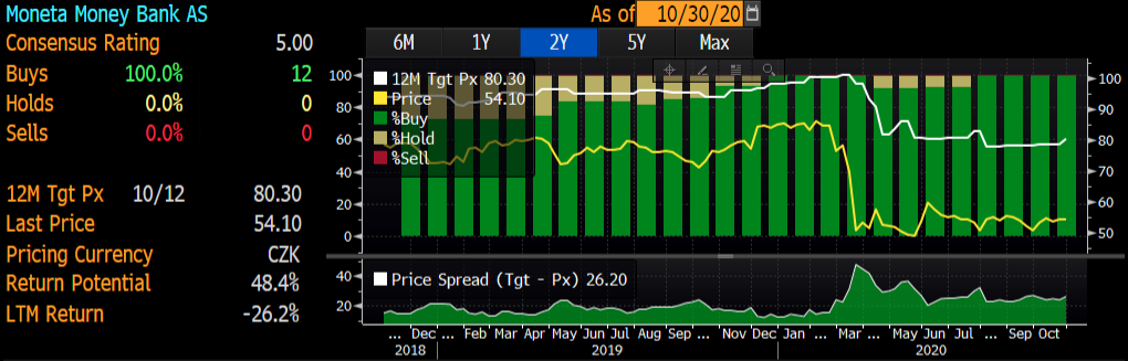 Dle agentury Bloomberg se vyplatí akcie nakoupit. Všech 12 oslovených analytiků doporučuje "buy" na akcie společnosti Moneta (MONET.CZ) s dvanáctiměsíční cílovou cenou 80,30 korun na akcii. Zdroj: Bloomberg