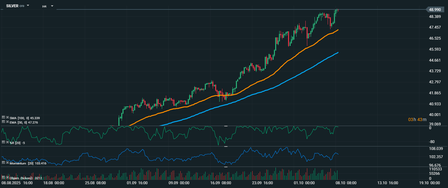 Cena striebra pokračuje v silnom rastovom trende a aktuálne sa obchoduje na úrovni 48,99 USD. Trh je momentálne vo fáze dynamického rastu, ktorý je podporený silnou technickou konfiguráciou. Cena sa drží vysoko nad kĺzavými priemermi – EMA 50 je na úrovni 47,27 USD a SMA 100 na 45,34 USD. Tento rozostup potvrdzuje býčiu dominanciu a silné momentum. Momentum dosahuje hodnotu 103,4, čo je ďalšie potvrdenie o pretrvávajúcej nákupnej sile. Tiež Williams %R sa nachádza tesne pri hranici -5, teda v oblasti prekúpenosti, čo môže signalizovať krátkodobé spomalenie rastu alebo konsolidáciu. Z pohľadu objemov možno pozorovať zvýšenú aktivitu, ktorá podporuje aktuálny rast. Trh tak môže smerovať k otestovaniu hranice 50 USD, ktorá by mohla zohrať rolu ďalšej významnej rezistencie.