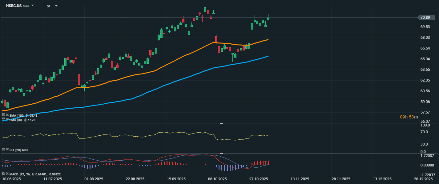 Akcie banky HSBC v posledných dňoch obnovili rast a aktuálne sa obchodujú na úrovni 70,89 USD, teda v tesnej blízkosti historického maxima, ktoré sa nachádza mierne nad touto hladinou. Cena sa opäť dostala nad kĺzavé priemery EMA 50 (67,78 USD) a SMA 100 (66,43 USD), čo je býčí signál a naznačuje návrat pozitívneho sentimentu na trh. RSI sa pohybuje na úrovni 60,3 – v neutrálnom pásme, no s tendenciou rastu, čo naznačuje priestor na pokračovanie trendu bez rizika prekúpenosti.
