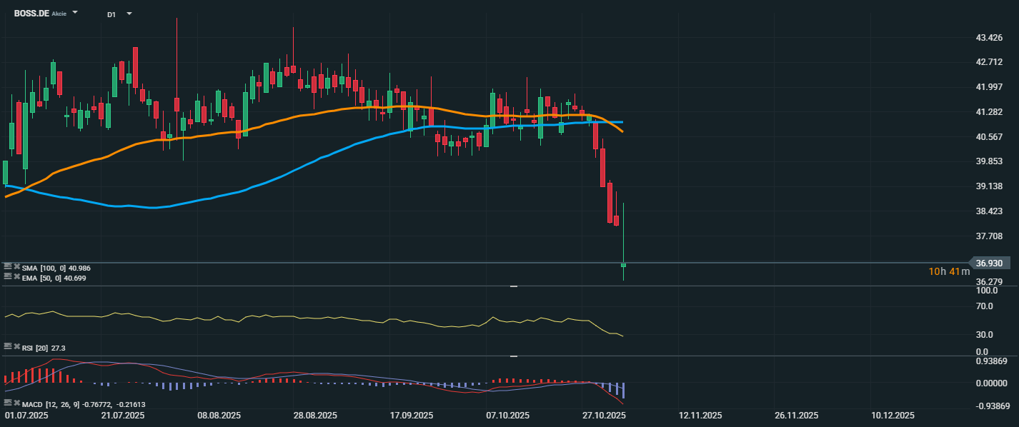 Akcie Hugo Boss sa po zverejnení slabších kvartálnych výsledkov dostali pod silný predajný tlak a zaznamenali výrazný prepad. Cena sa aktuálne obchoduje na úrovni 36,93 EUR, čo predstavuje výrazný pokles oproti predchádzajúcim hodnotám nad 40 EUR. Trh tak jasne reaguje na sklamanie z vývoja tržieb a slabší výhlaď spoločnosti na zvyšok roka. Akcie prudko prepadli pod oba kľúčové kĺzavé priemery – SMA 100 (40,99 EUR) aj EMA 50 (40,70 EUR) – čím bol potvrdený obrat do klesajúceho trendu.