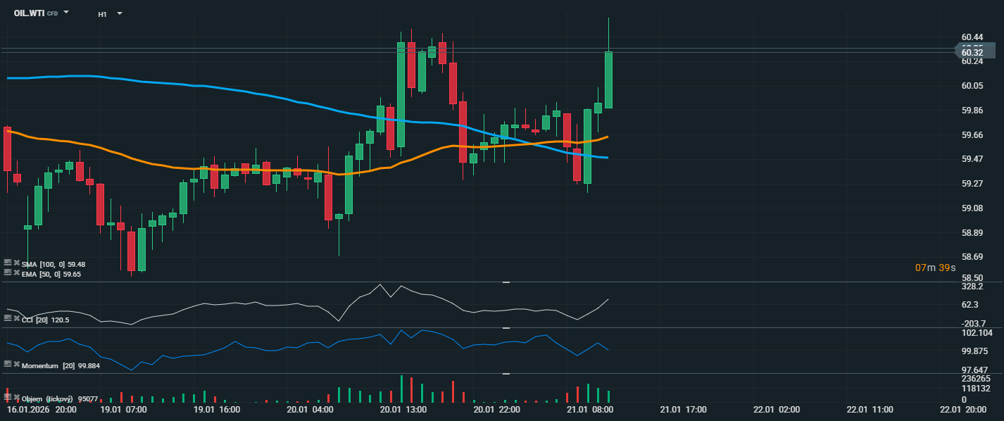 Cena americkej ropy WTI prudko vzrástla a aktuálne sa obchoduje v blízkosti 60,32 USD, čím výrazne prerazila nad oba kĺzavé priemery – EMA 50 (59,65 USD) a SMA 100 (59,48 USD). Tento preraz naznačuje zmenu krátkodobého trendu v prospech kupujúcich. CCI dosahuje hodnotu 120,5, čo značí vstup do prekúpenej zóny, no zároveň potvrdzuje silu aktuálneho nákupného momenta. Momentum sa pohybuje na úrovni 99,88, čo taktiež potvrdzuje pozitívny impulz. Objem obchodov v posledných sviečkach výrazne vzrástol, čo podporuje vierohodnosť tohto pohybu. Z technického hľadiska je aktuálna cenová úroveň kľúčová – ak sa trhu podarí udržať nad hranicou 60 USD, môže to otvoriť priestor na ďalší rast smerom k 60,80 USD alebo vyššie. Naopak, návrat pod EMA a SMA by mohol znamenať falošný preraz a návrat do konsolidačného pásma.