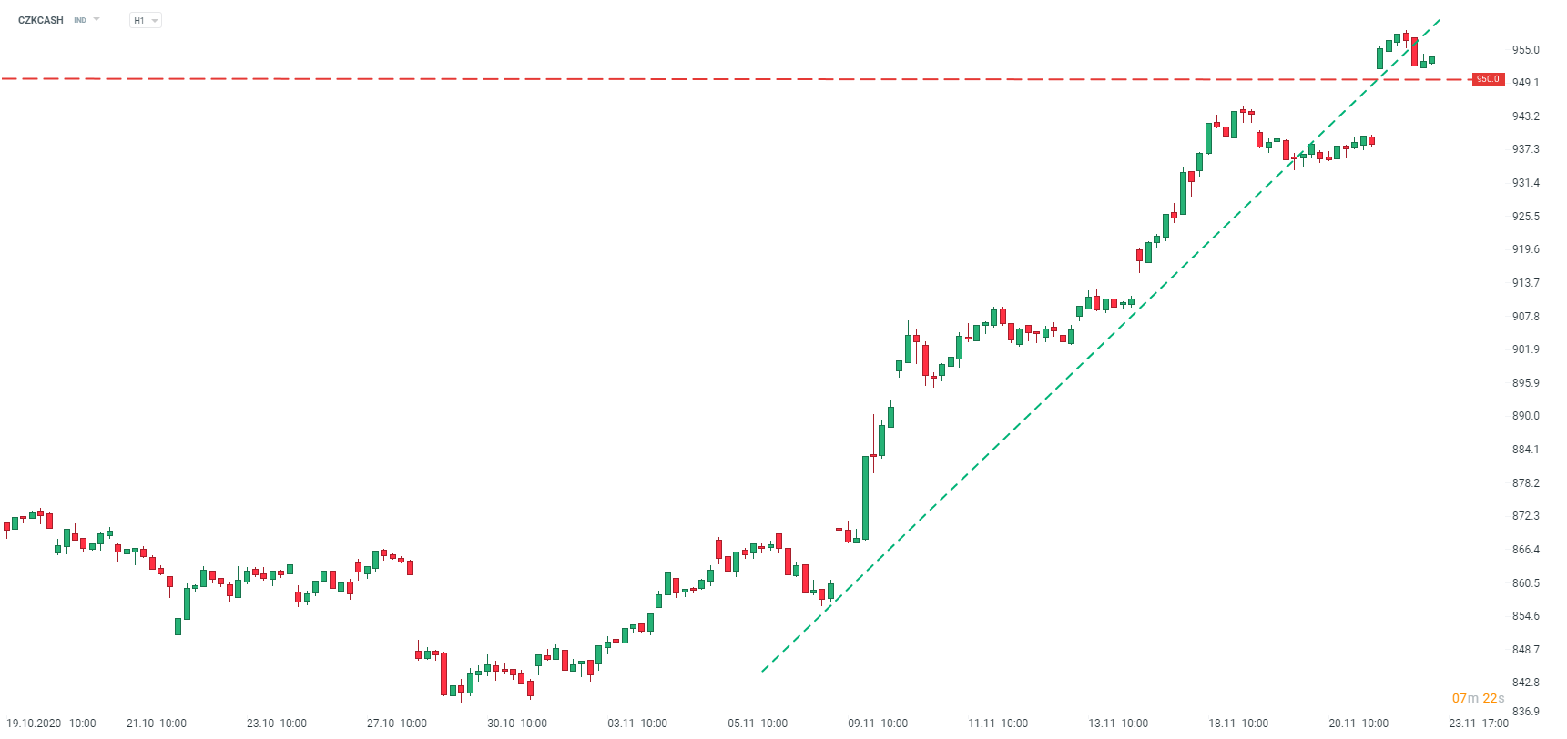 České akcie dnes následovaly pozitivní vývoj na globálních trzích. Pražský index PX (CZKCASH) vzrostl o 1,39 % na 955,22 bodů a pokračuje tak v ukrajování jarních koronavirových ztrát. Tahounem indexus byly akcie Monety Money Bank (MONET.CZ), které přidaly 3,67 % na závěrečných 67,70 Kč. Dobré výsledky předvedly tak Erste Bank (RBAG.CZ) se ziskem 0,68 % na 622,60 Kč a Komerční banka (KOMB.CZ) s růstem o 0,87 % na 581 Kč. Akcie společnosti ČEZ (CEZ1.CZ) přidaly 0,96 % na 474,50 Kč. Objem obchodů s akciemi na pražské burze dnes vystoupal na 537 mil. Kč.