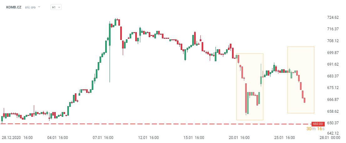 Akcie Komerční banky (KOMB.CZ) dnes táhly ztráty pražských Blue Chips a přiblížily se k minimům letošního roku. Zdroj: xStation5