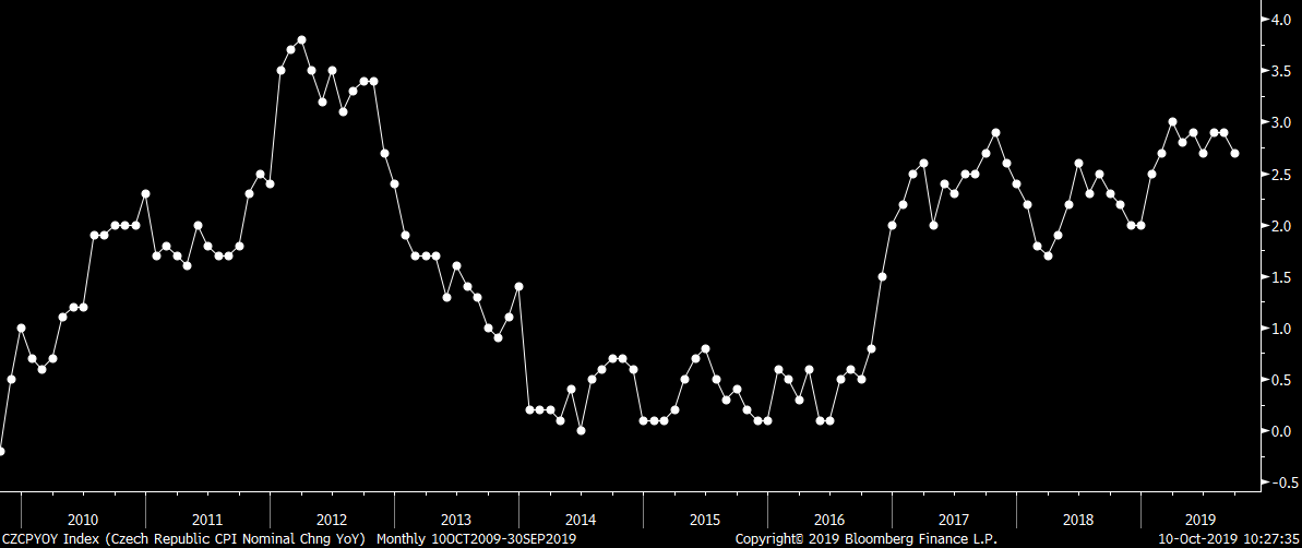 Inflace v Česku meziročně zpomalila na 2,7 %. Zdroj: Bloomberg