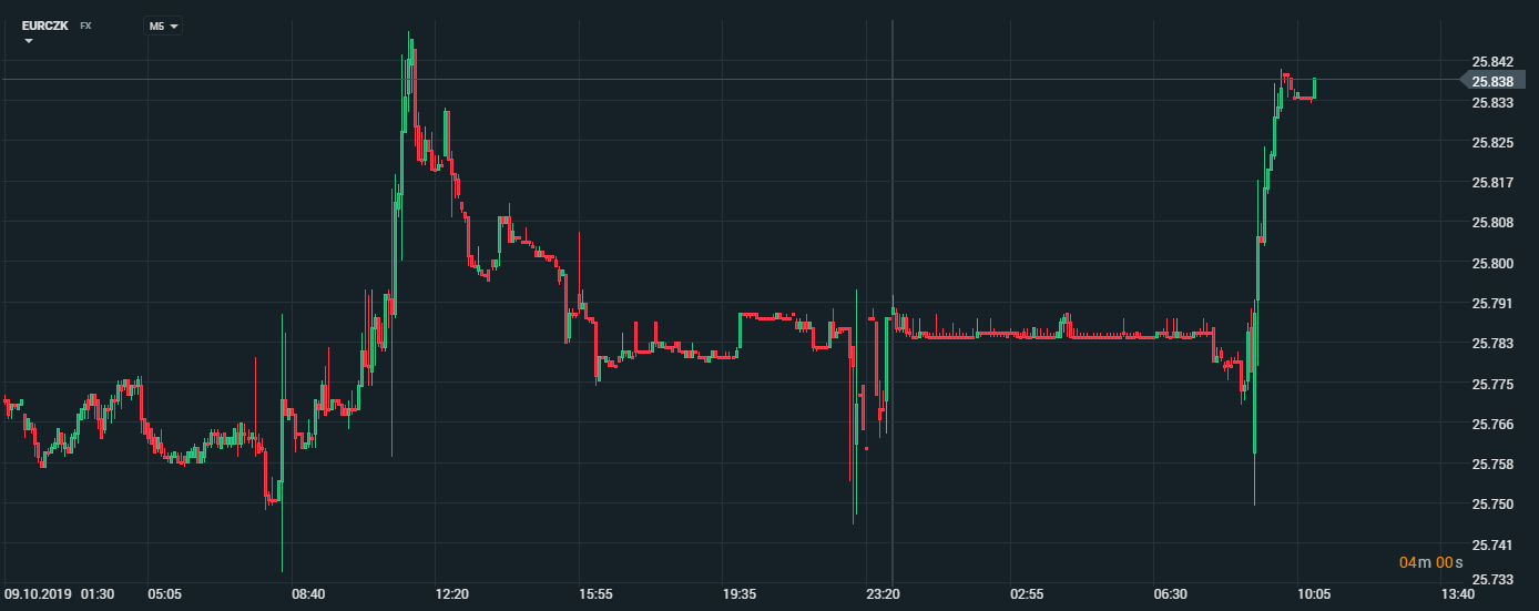 Česká měna reagovala na zveřejnění výsledků oslabení a na páru s eurem se dostala až na cenu 25,83 EURCZK. Zpomalení inflace de facto vylučuje již tak malé šance na listopadové zvýšení sazeb. Na spekulace o snižování sazeb v důsledku zpomalující ekonomiky je však stále, právě díky vysoké inflaci, příliš brzy.
